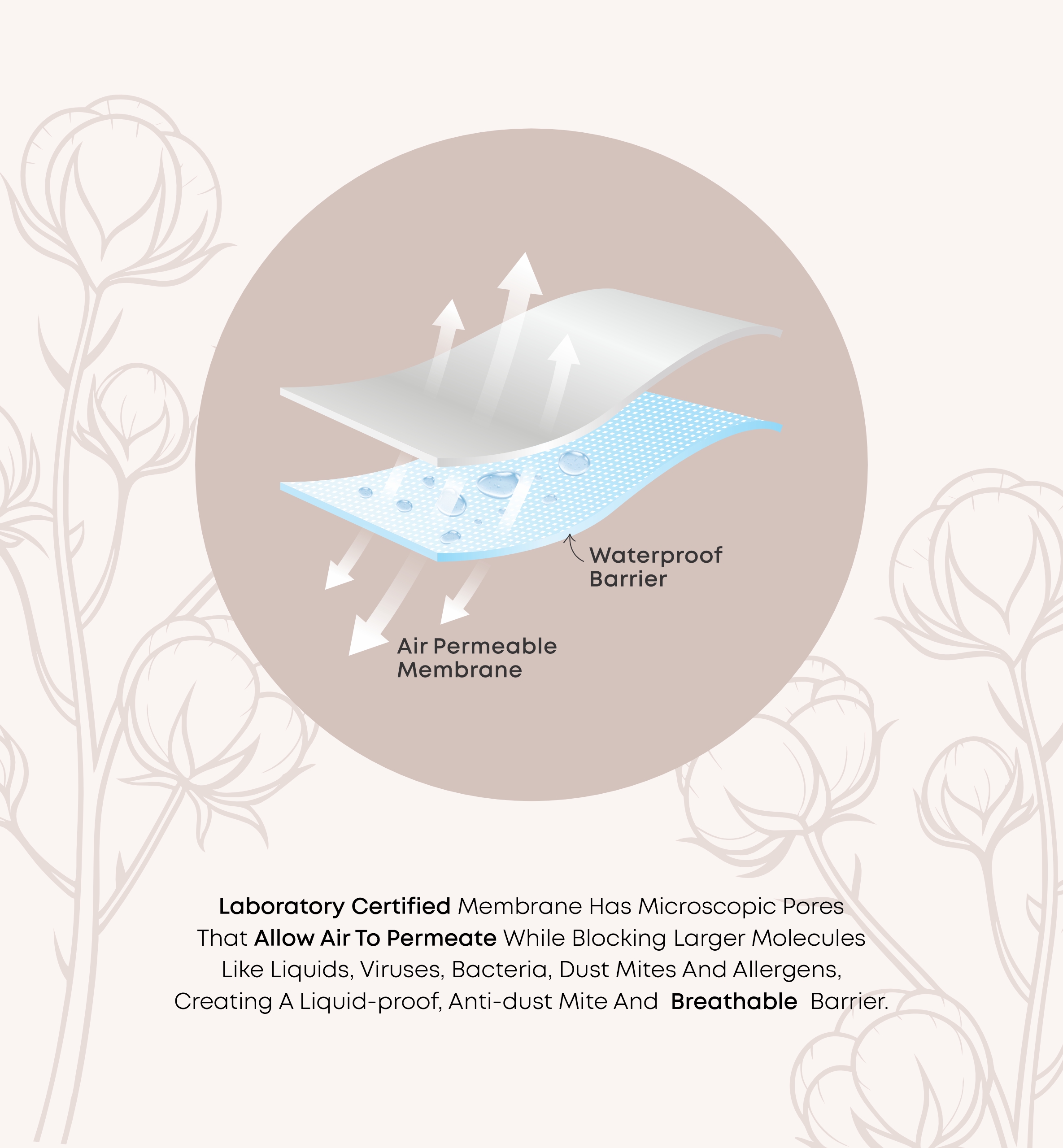 Technical Details: Laboratory certified membrane has microscopic pores that allow air to permeate while blocking larger molecules like liquids, viruses, bacteria, dust mites and allergens, creating a liquid-proof, anti-dust mite and breathable barrier.