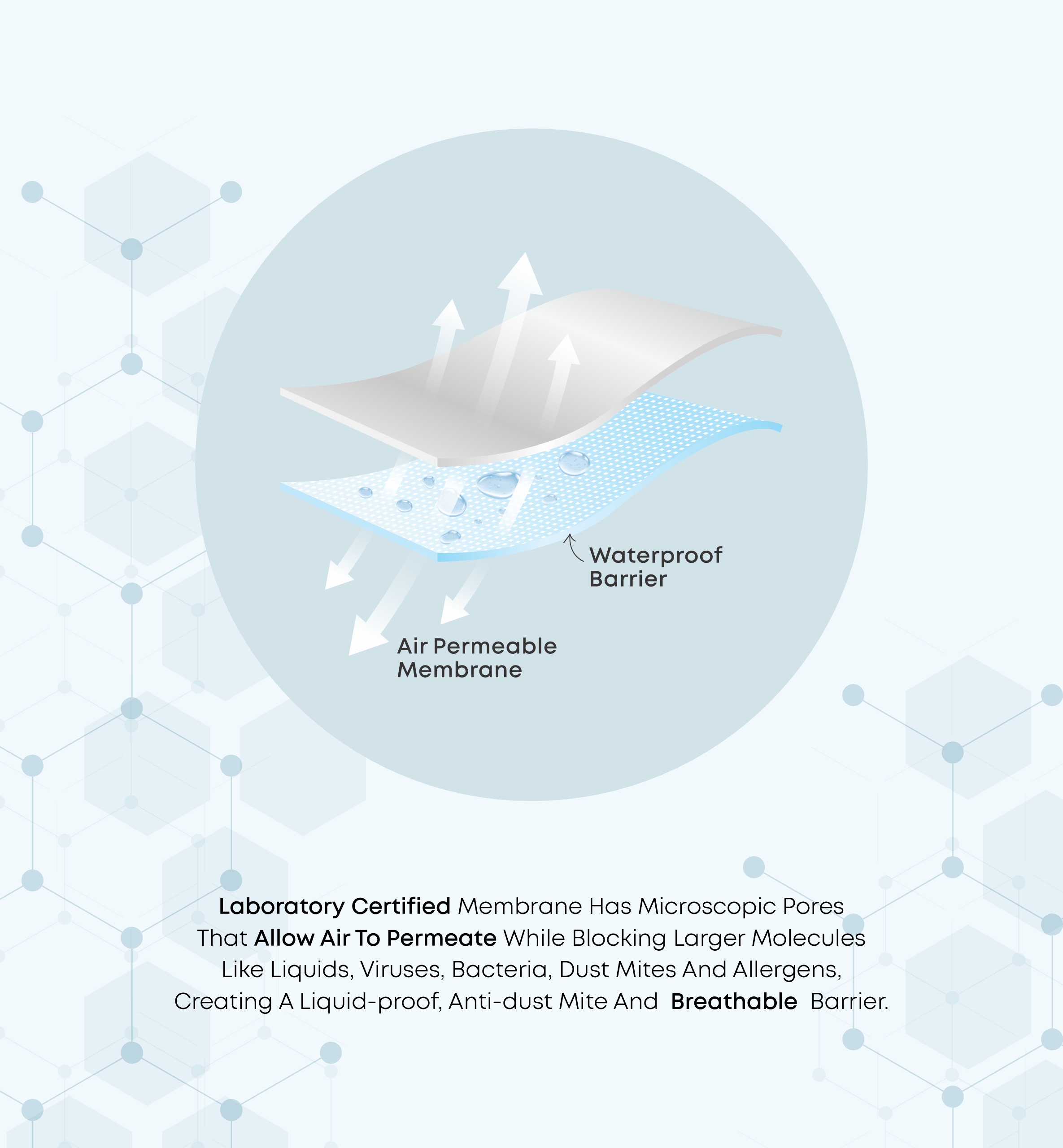 Technical Details: Laboratory certified membrane has microscopic pores that allow air to permeate while blocking larger molecules like liquids, viruses, bacteria, dust mites and allergens, creating a liquid-proof, anti-dust mite and breathable barrier.