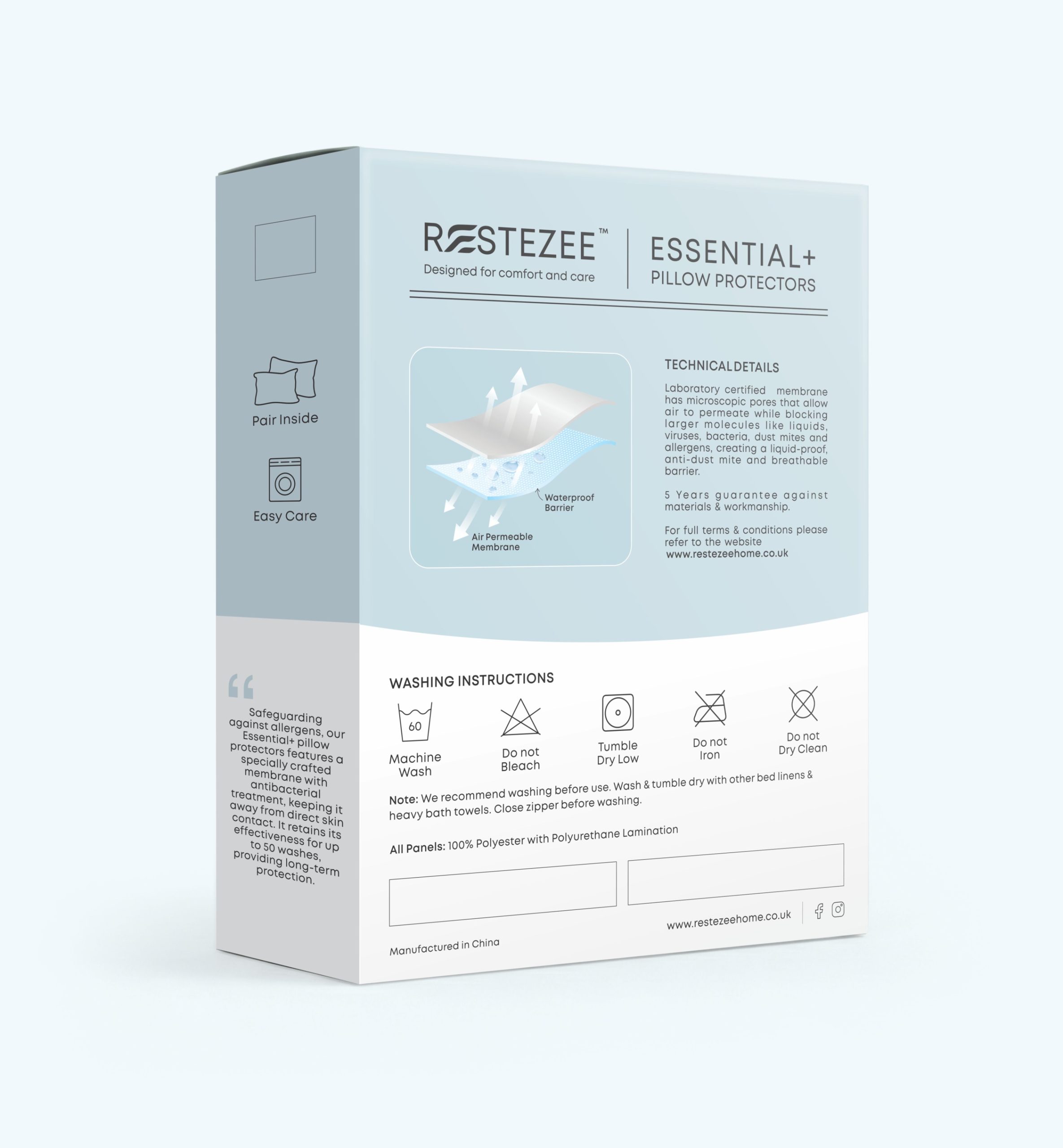 Safeguarding against allergens, our Essential+ pillow protectors features a specially crafted membrane with antibacterial treatment, keeping it away from direct skin contact. It retains its effectiveness for up to 50 washes, providing long-term protection.